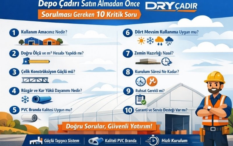 Bu rehberde, DRY Çadır uzmanlığıyla, depo çadırı satın alma sürecinde mutlaka değerlendirilmesi gereken 10 kritik soruyu tüm teknik detaylarıyla ele aldık.