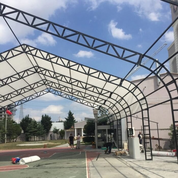 Basketbol sahası çadırı, dört mevsim boyunca spor faaliyetlerini kesintisiz sürdürebilmek için tasarlanmış dayanıklı yapılardır. UV korumalı ve su geçirmez PVC branda ile üretilir, galvanizli çelik konstrüksiyon sayesinde uzun yıllar güvenli kullanım sunar.